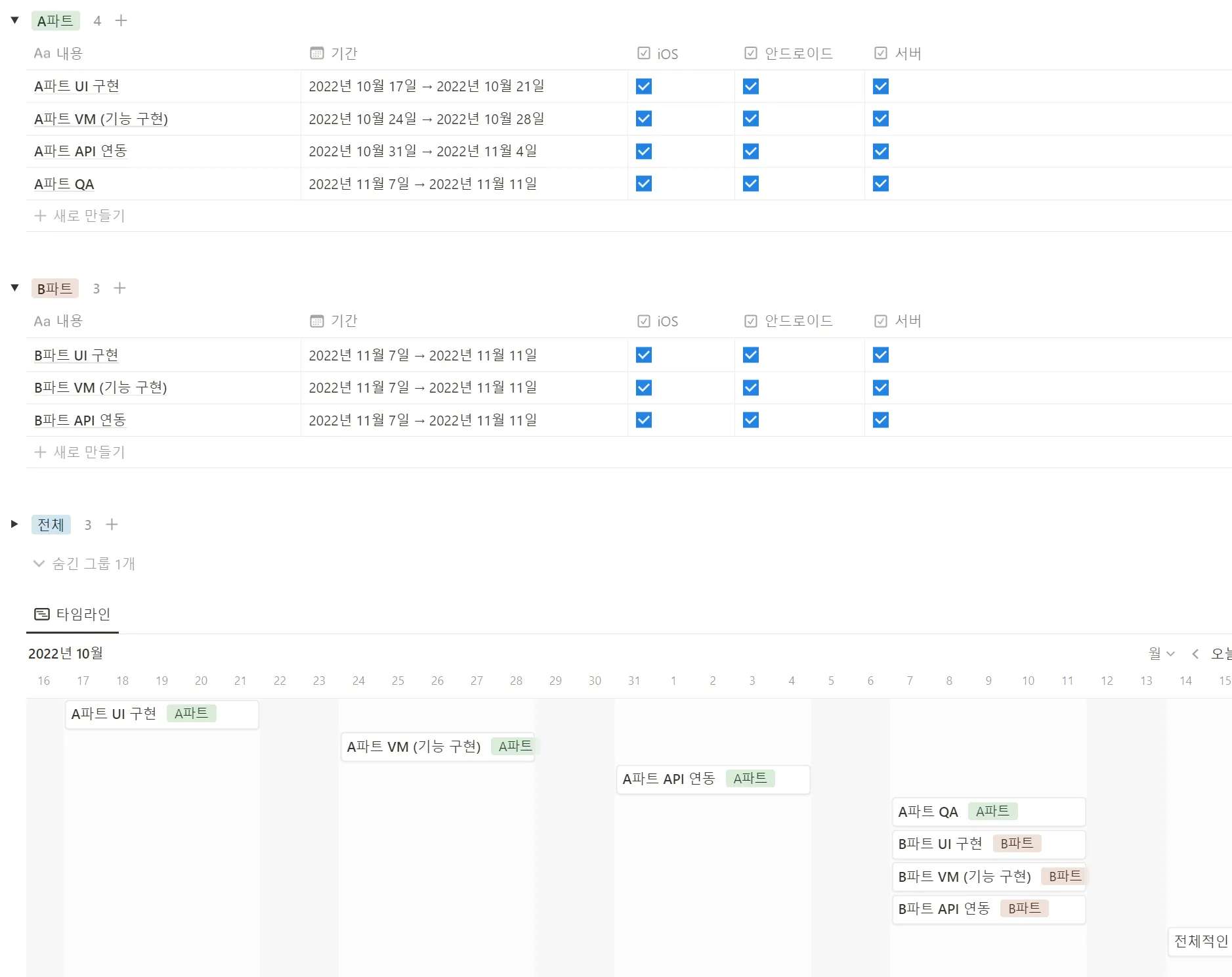 각 기간별로 진행되어야 할 작업량을 산정하고 체크리스트를 통해 진행 상태를 관리하였습니다. 협업하는 동료들에게 명확한 목표를 보여줌으로써 개발 동기 향상을 도모하였습니다.