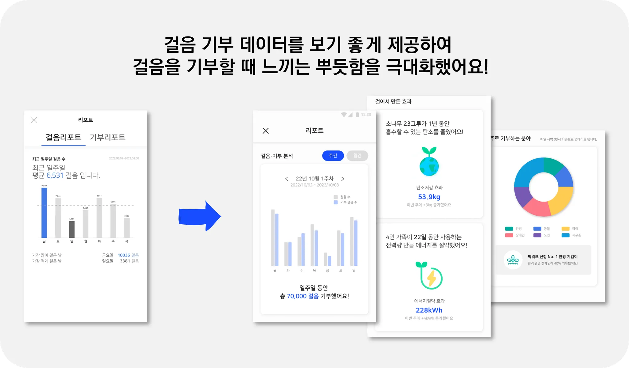 리포트 리뉴얼 전보다 후에 리포트에서 느끼는 걸음 기부의 뿌듯함이 클 것이다.