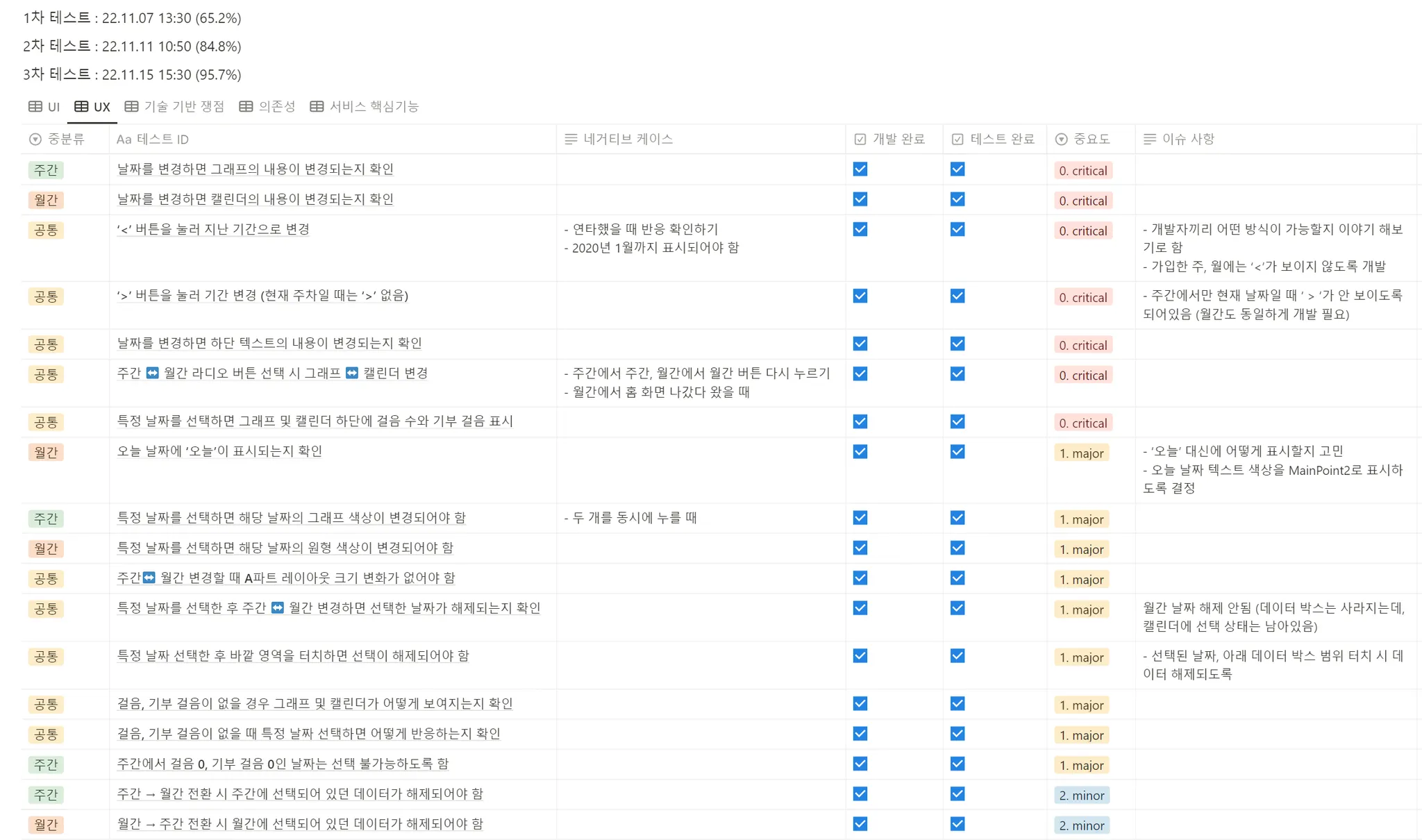 완성도 높은 프로덕트를 위해 교차 테스트나 네거티브 케이스 테스트 등의 방법을 동원하여 QA를 진행하고, 테스트 이슈 관리를 수행하였습니다.