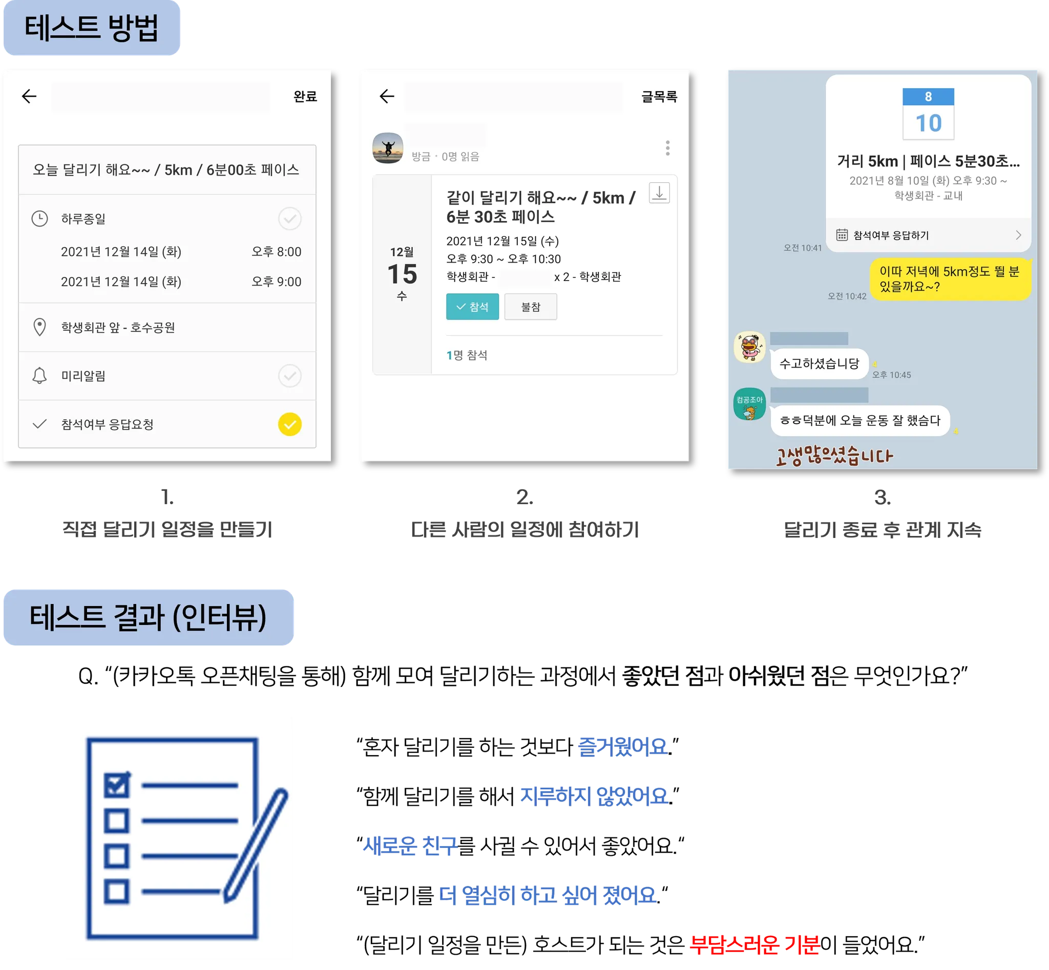 실제 수요를 가진 사람이 얼마나 되는지 확인하기 위해 카카오톡 오픈채팅 기능을 활용하여 교내 대학생/대학원생을 대상으로 100일간 테스트를 실시하였습니다. 이 기간동안 130여 명의 학생이 입장하였고, 평균 주 3회의 달리기 모임이 개설되는 것을 확인할 수 있었습니다.
