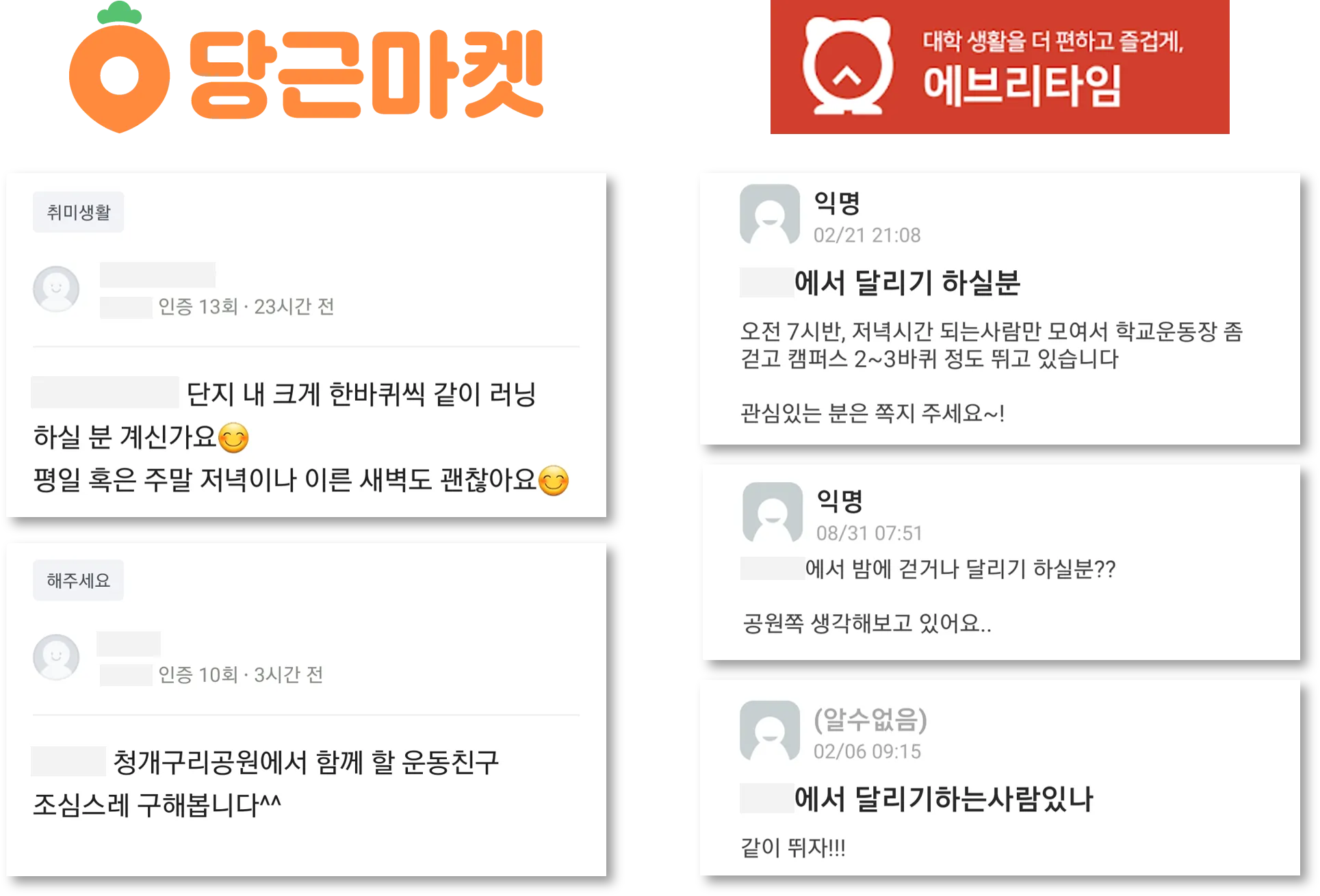 같은 동네를 기반으로 하는 ‘당근마켓’, 같은 대학교를 기반으로 하는 ‘에브리타임’ 서비스에서 함께 달리기를 할 사람을 구하는 모습을 볼 수 있습니다.
