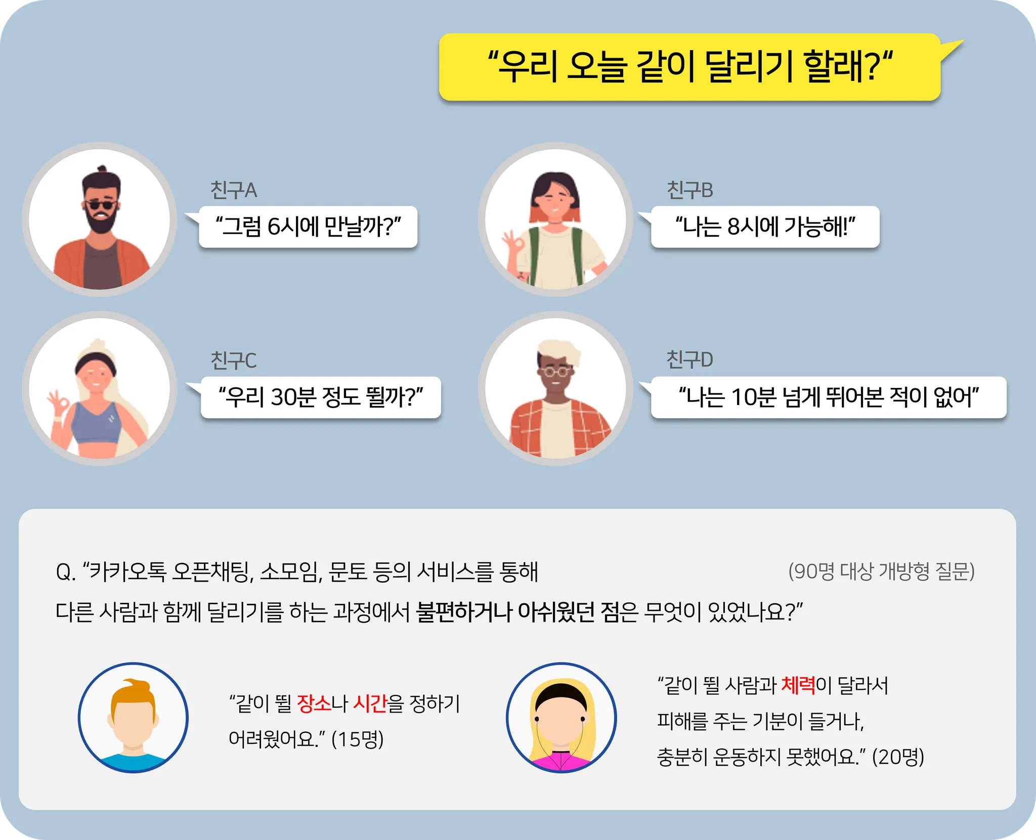 그러나 바쁜 현대사회에 주변 지인들과 같이 달리기를 하기 위한 시간을 맞추는 것은 번거롭습니다. 또, 서로의 체력 수준이 달라도 같이 달리기를 즐기기 어렵습니다.